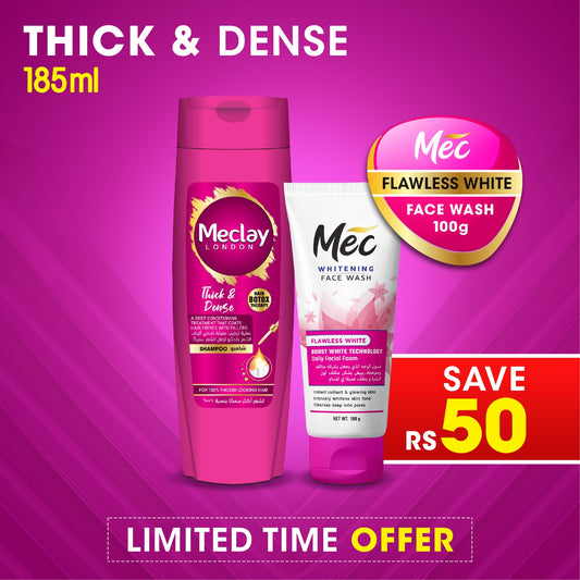 Meclay London Thick & Dense Shampoo 185ml With Conditioner 180ml + Mec Flawless White Face Wash Pair Box (Save Rupees 200)